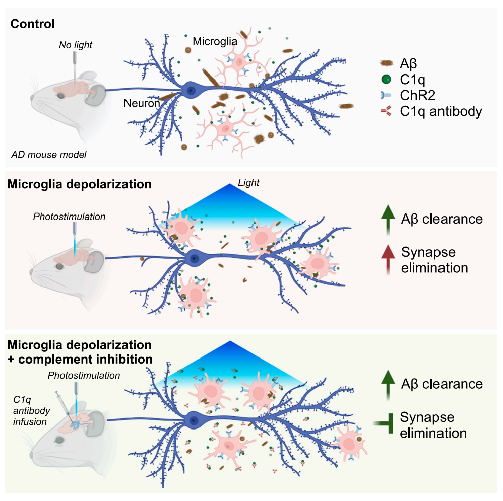 基于小胶质细胞和神经元之间的紧密关联及其在神经退行性疾病中的作用,研究团队成功建立了一套在体外和体内特异性去极化激活小胶质细胞的方法。通过光遗传方法激活小胶质细胞,发现小胶质细胞去极化可以促进脑实质中Aβ的清除,但同时也会增强神经突触的消除。研究团队进一步寻找了神经突触清除的关键机制,发现补体信号通路C1q可以选择性地防止小胶质细胞去极化诱导的突触损伤,但不影响Aβ清除。该研究给出了一种小胶质细胞靶向调控的有效方法,揭示了小胶质细胞介导的独立吞噬途径,给出了一种针对神经退行性疾病治疗的病理性蛋白清除和神经保护的协同策略。