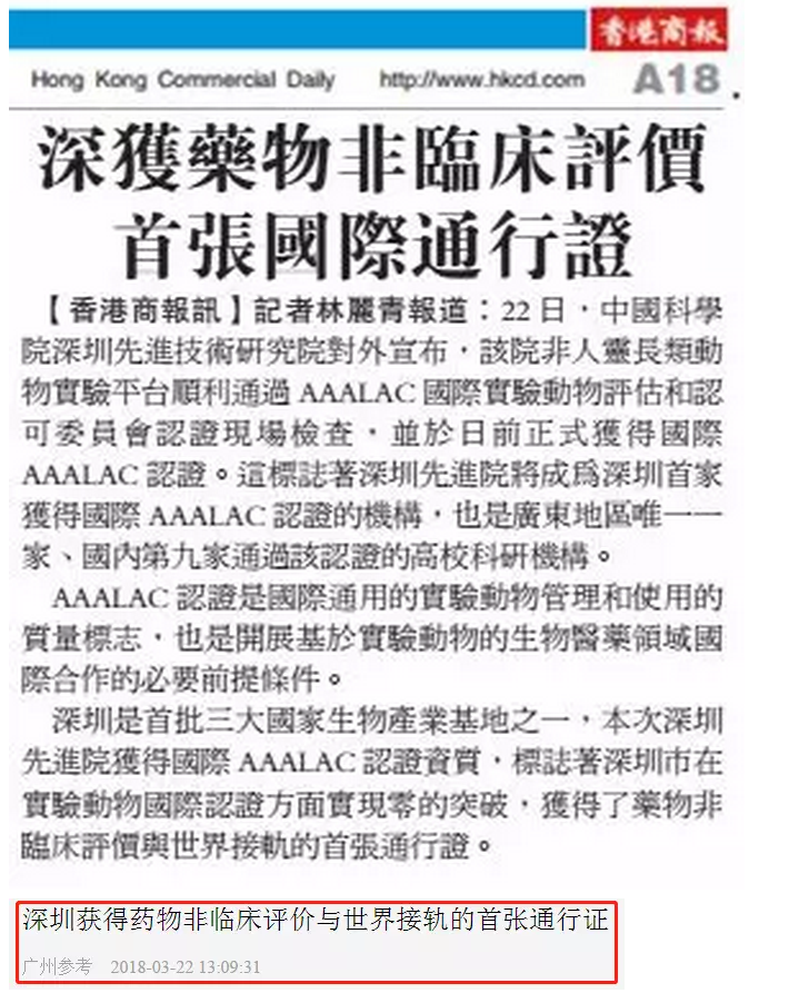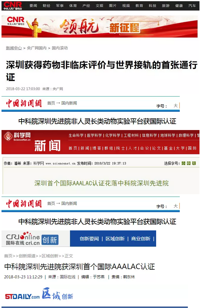 3月22日,中国科学院深圳先进技术研究院正式对外宣布,非人灵长类动物实验平台顺利通过AAALAC国际实验动物评估和认可委员会(Association for Assessment and Accreditation of Laboratory Animal Care)认证现场检查,并于日前正式获得国际AAALAC认证。这标志着深圳先进院成为深圳首家获得国际AAALAC认证的机构,也是广东地区唯一一家、国内第九家通过该认证的高校科研机构。