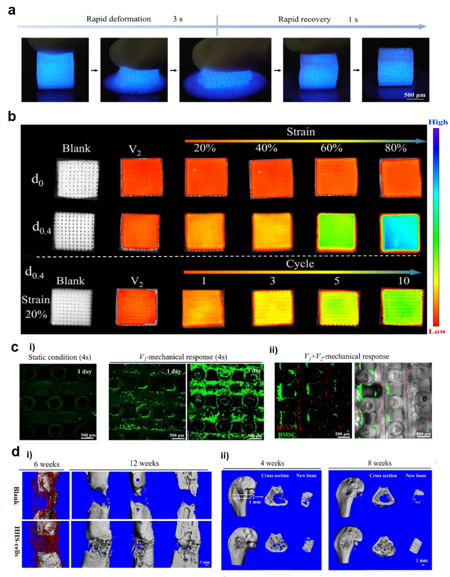 研究团队采用同轴针头且在没有支撑条件下,一步法3D打印成功构建了具有结构高度可调的中空水凝胶支架,该支架在压缩应变达80%下可以快速恢复(图2a),并且压缩循环1万次后仍能保持完整的结构。此外,该支架具有力学响应性,通过压缩应变、循环次数可以实现对其响应行为的调控(图2b)。HHS在力学刺激下可以实现细胞的快速(4 s)、精准和分区负载(图2c)。与静态条件下相比,HHS负载细胞数量提高了13倍。我们提出的“生物3D打印+”策略突破了生物3D打印受限于生物墨水无法构建兼具无损细胞和优异力学性能的水凝胶支架。作为概念的验证,负载细胞的HHS在修复大鼠节段性和骨质疏松骨缺损(图2d)方面显示出了增强的再生能力,有望为组织再生领域和细胞治疗提供新的途径。