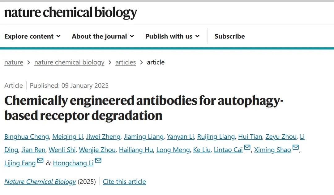 1月9日,由中国科学院深圳先进技术研究院(简称“深圳先进院”)医药所纳米医疗技术研究中心李红昌研究员、房丽晶研究员、蔡林涛研究员和邵喜明副研究员组成的学科交叉团队,在国际知名期刊Nature Chemical Biology上以“Chemically Engineered Antibodies for Autophagy-based Receptor Degradation”为题发表最新研究成果。在这项研究中,他们成功开发出一种全新的基于自噬机制的细胞膜蛋白靶向降解技术——AUTAB(autophagy-inducing antibody)。该技术通过将细胞自噬诱导分子与细胞膜蛋白靶点抗体进行共价偶联,实现了在不依赖额外细胞表面蛋白的情况下,精确触发靶点蛋白通过自噬-溶酶体路径降解。这一成果为以细胞膜蛋白为靶点的药物研发提供了一种新的广谱适用策略。