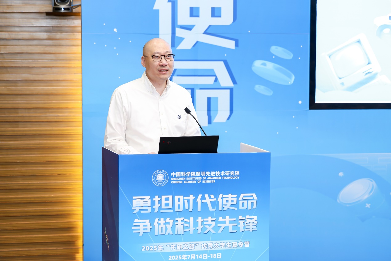 7月14日下午夏令营开营仪式。深圳先进院院长刘陈立首先代表全体师生向营员们表示热烈欢迎,并向同学们介绍了中国科学院深圳先进技术研究院(以下简称“先进院“)的发展特色、培养优势和前景。数字所研究员董超作为导师代表上台发言,以自身科研经历诠释了前沿创新的科学精神。随后,夏令营营员代表秦景荣分享了自己的对先进院的初体会。本次开营活动还特别邀请到中国科学院大学专家就校史及"两弹一星"精神作专题报告,为营员们上了一堂生动的科学精神教育课。