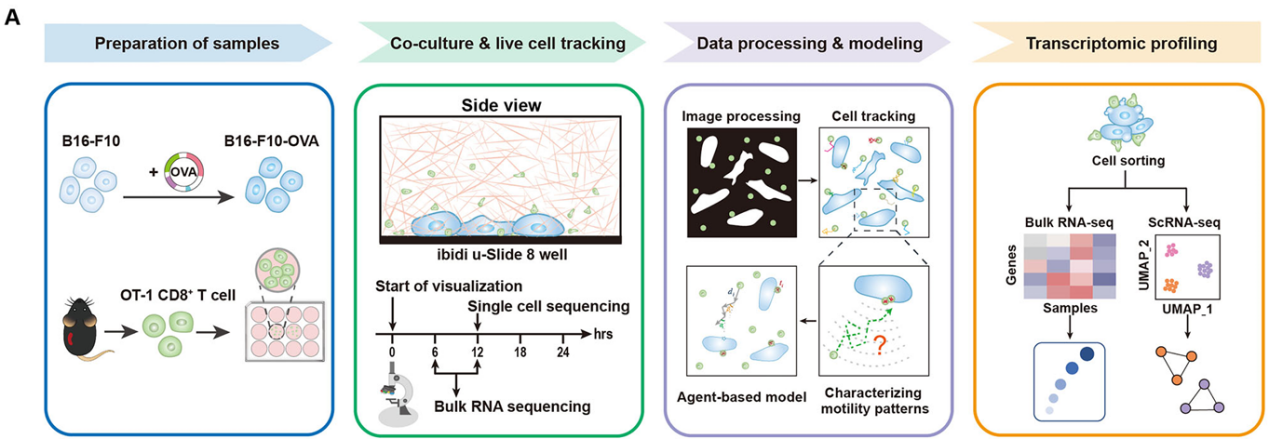 研究团队搭建了一个多癌团簇的2.5D体外共培养体系,结合活细胞延时成像、细胞轨迹定量分析、计算建模与转录组测序(包括bulk和单细胞RNA测序)(图2),系统地研究了肿瘤抗原特异性T细胞在肿瘤团簇周围的运动模式。