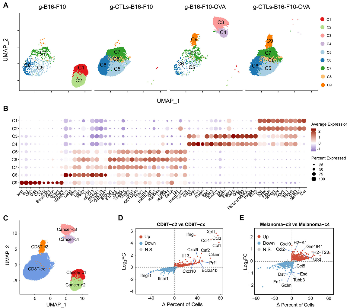 有趣的是,研究团队还发现部分存活的肿瘤细胞在T细胞攻击后发生了表型转变。通过bulk和单细胞转录组分析,研究识别出一类具有免疫逃逸特征的肿瘤细胞亚群(Cancer-C4):该亚群不仅显著下调趋化因子(如CXCL9/10)表达(图5),还激活上皮-间充质转化(EMT)相关通路,表现出更强的迁移性和免疫逃逸特征。