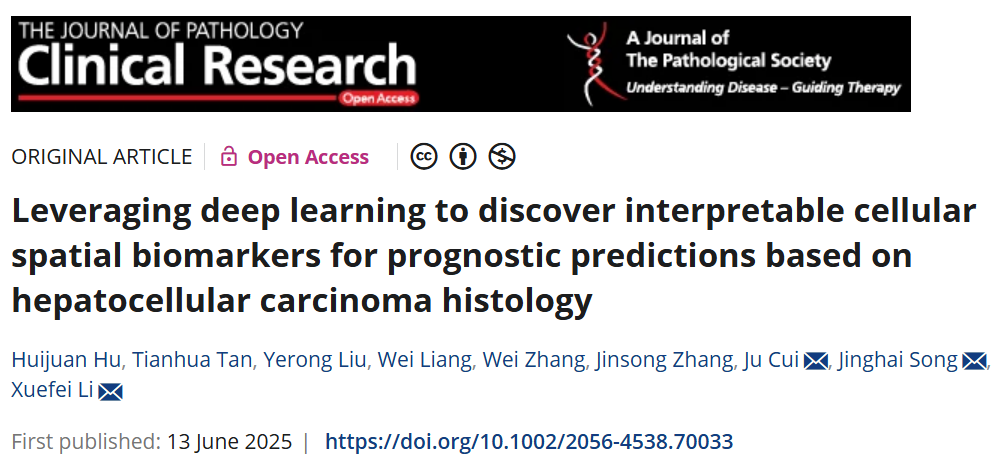 此前不久(6月13日)李雪飞研究团队联合北京医院宋京海教授、崔菊研究员团队在The Journal of Pathology: Clinical Research上发表了题为Leveraging deep learning to discover interpretable cellular spatial biomarkers for prognostic predictions based on hepatocellular carcinoma histology”的研究论文(图6)。该工作开发了一套基于深度学习的组织图像处理流程,构造了一系列细胞空间分布特征,系统识别并量化肝细胞癌(HCC)组织中多种细胞类型的空间分布特征,发现具备独立预后预测价值的空间生物标志物,为病理图像的结构解析和术后风险评估提供了新思路。
