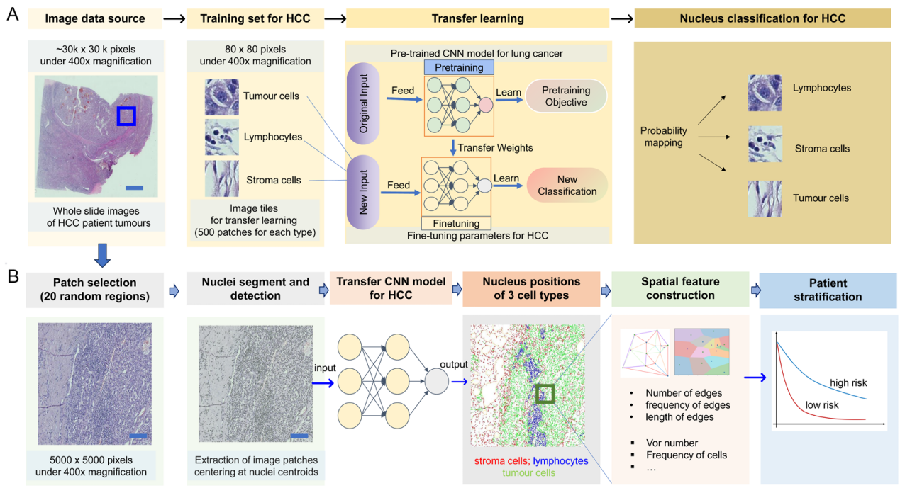 研究开发了端到端的图像处理流程(图7,结合深度学习分类器与图论方法(Delaunay三角与Voronoi图),从常规临床肿瘤切片(苏木素-伊红染色法中识别肝癌组织内的肿瘤、免疫和基质细胞,构建空间邻接网络,提取共计109种拓扑结构特征。