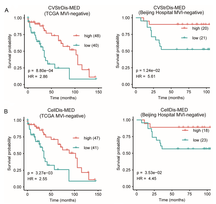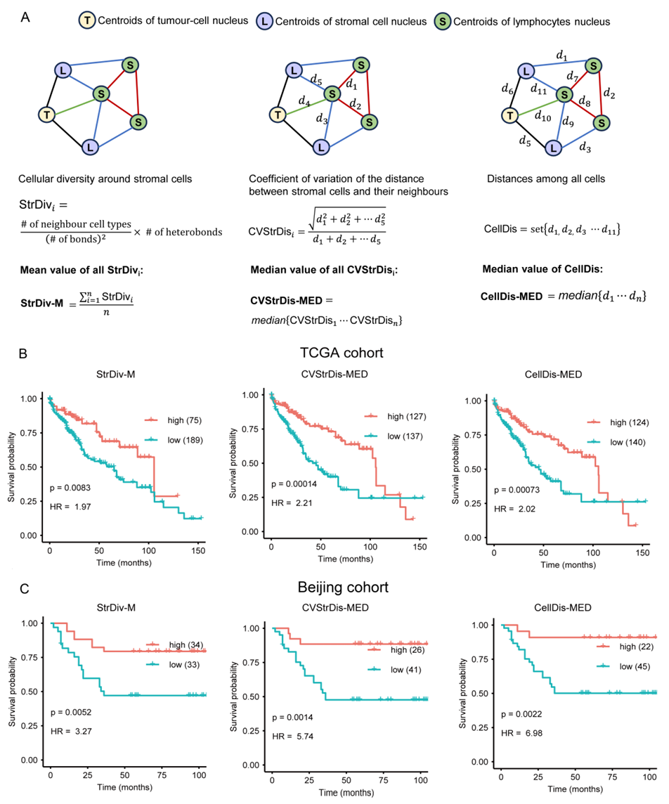 通过对公开数据库TCGA及北京医院两大患者队列的回顾性分析,研究最终筛选出鉴定出6种细胞空间特征与患者总体生存期显著相关采用一致的阈值时,这些空间特征在两个队列中均表现出显著的预后指示作用(图8),且部分特征的组合,如基质细胞周围的细胞多样性均值(StrDiv-M)、细胞间距离中位数(CellDis-MED)等,能够进一步优化患者的生存周期分层。