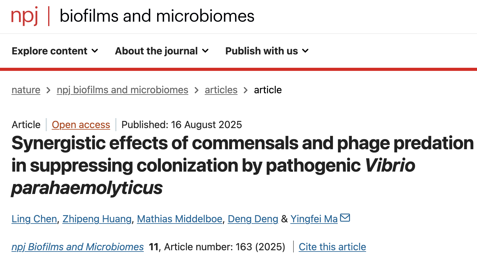 8月16日,中国科学院深圳先进技术研究院定量合成生物学全国重点实验室、合成生物学研究所马迎飞团队,在国际学术期刊《npj Biofilms and Microbiomes》(中国科学院1区top期刊,最新 IF=9.2)发表了题为“Synergistic effects of commensals and phage predation in suppressing colonization by pathogenic Vibrio parahaemolyticus”的研究成果。该研究由马迎飞团队与澳华集团共同推进,双方历经5年深入产业化合作,围绕南美白对虾弧菌病害防控的实际需求展开联合攻关。研究通过多组学联合分析和体内外模型验证,锁定南美白对虾肠道内“共生菌屏障”与“噬菌体精准靶向”两大核心机制,首次提出“共生菌-噬菌体协同防控”策略。研究团队基于关键肠道共生菌构建了合成菌群,联合副溶血弧菌噬菌体,将遭受弧菌感染的对虾存活率从23%提升至69%,这一绿色、精准、可预防的微生态干预方案,为替代抗生素、防控南美白对虾弧菌病害提供了新范式。