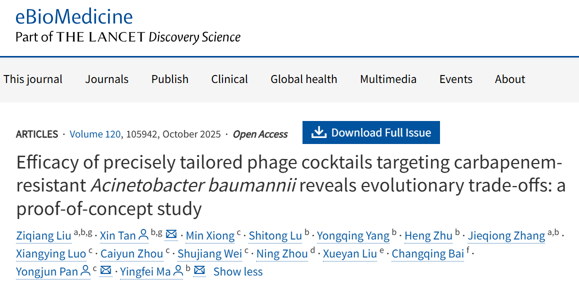 9月18日,中国科学院深圳先进技术研究院定量合成生物学全国重点实验室、合成生物学研究所合成微生物组学研究中心马迎飞团队,联合南方科技大学医院重症医学科潘勇军团队、深圳大学总医院呼吸科柏长青团队以及深圳市人民医院重症医学科刘雪燕团队,在《柳叶刀》旗下转化医学领域重要期刊eBioMedicine(医学1区,IF=10.8)上发表了一项题为“Efficacy of Precisely Tailored Phage Cocktails Targeting Carbapenem-Resistant Acinetobacter baumannii Reveals Evolutionary Trade-offs: a proof-of-concept study”的研究论文。
