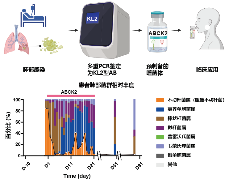 在后续临床应用中,研究团队使用ABCK2成功清除了两例患者肺部感染的KL2型鲍曼不动杆菌,展现出良好的治疗效果。该研究不仅验证了基于流行菌株分型精准设计固定配方噬菌体鸡尾酒的可行性与有效性,也为理解噬菌体-宿主共进化关系提供了关键证据。成功的临床案例突显了ABCK2在治疗多重耐药菌感染中的应用潜力,为推进下一代噬菌体疗法的临床转化奠定了重要基础。