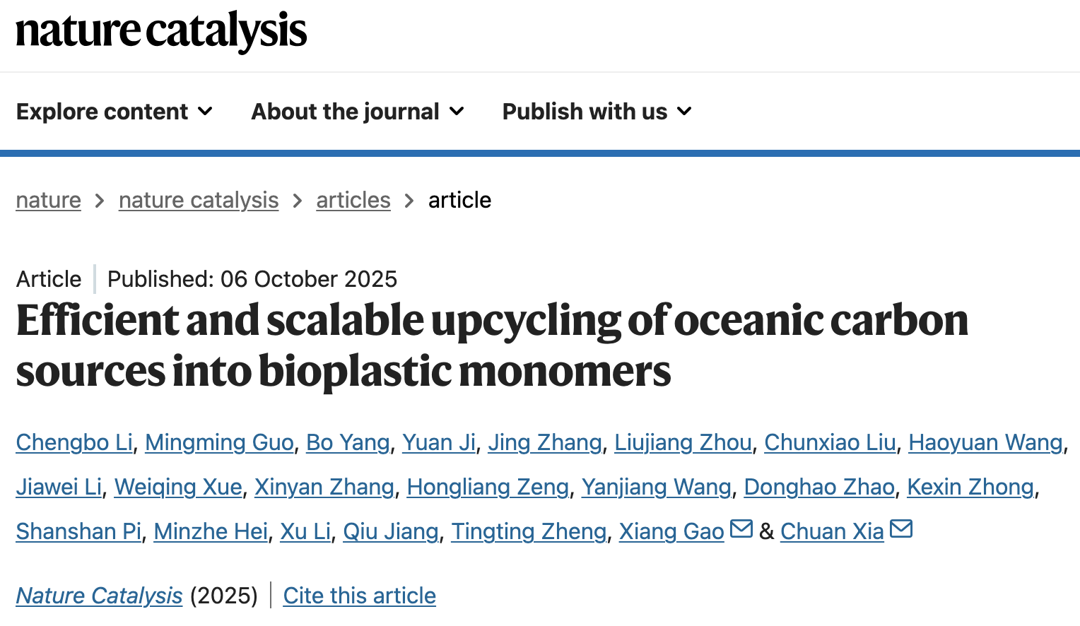 北京时间2025年10月6日,中国科学院深圳先进技术研究院合成生物学研究所高翔课题组与电子科技大学夏川课题组合作,在国际高水平学术期刊Nature Catalysis上发表了题为《Efficient and scalable upcycling of oceanic carbon sources into bioplastic monomers》的研究成果。团队率先提出并验证人工海洋碳循环系统:面向天然海水场景高效捕集CO2,电催化制备可进入生物制造的平台中间体,再经工程化微生物升级转化为高价值分子与材料。研究以可降解材料单体为示范,凸显“捕碳造物”的平台能力与可扩展性,为我国“蓝色经济”、双碳目标与绿色低碳技术创新提供新路径。