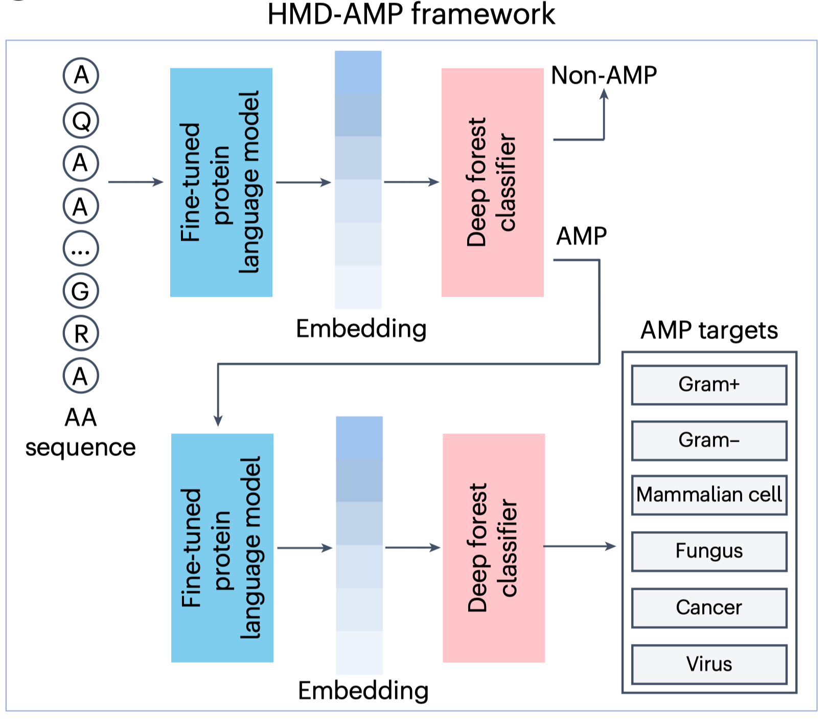 研究团队开发了基于蛋白质语言模型的抗菌肽挖掘工具——HMD-AMP。该框架利用经短肽数据微调的蛋白语言模型ESM-2提取深层序列特征,并结合分层多任务深度森林分类器,构建了端到端预测体系(图1)。与传统方法不同,蛋白质语言模型无需依赖显式序列比对,而是通过大规模无监督学习捕捉蛋白序列中的“隐式语义表示”——即进化与结构层面的深层规律。HMD-AMP不仅能够精准区分抗菌肽与非抗菌肽,还能预测抗菌谱类型,实现更精细的功能评估。