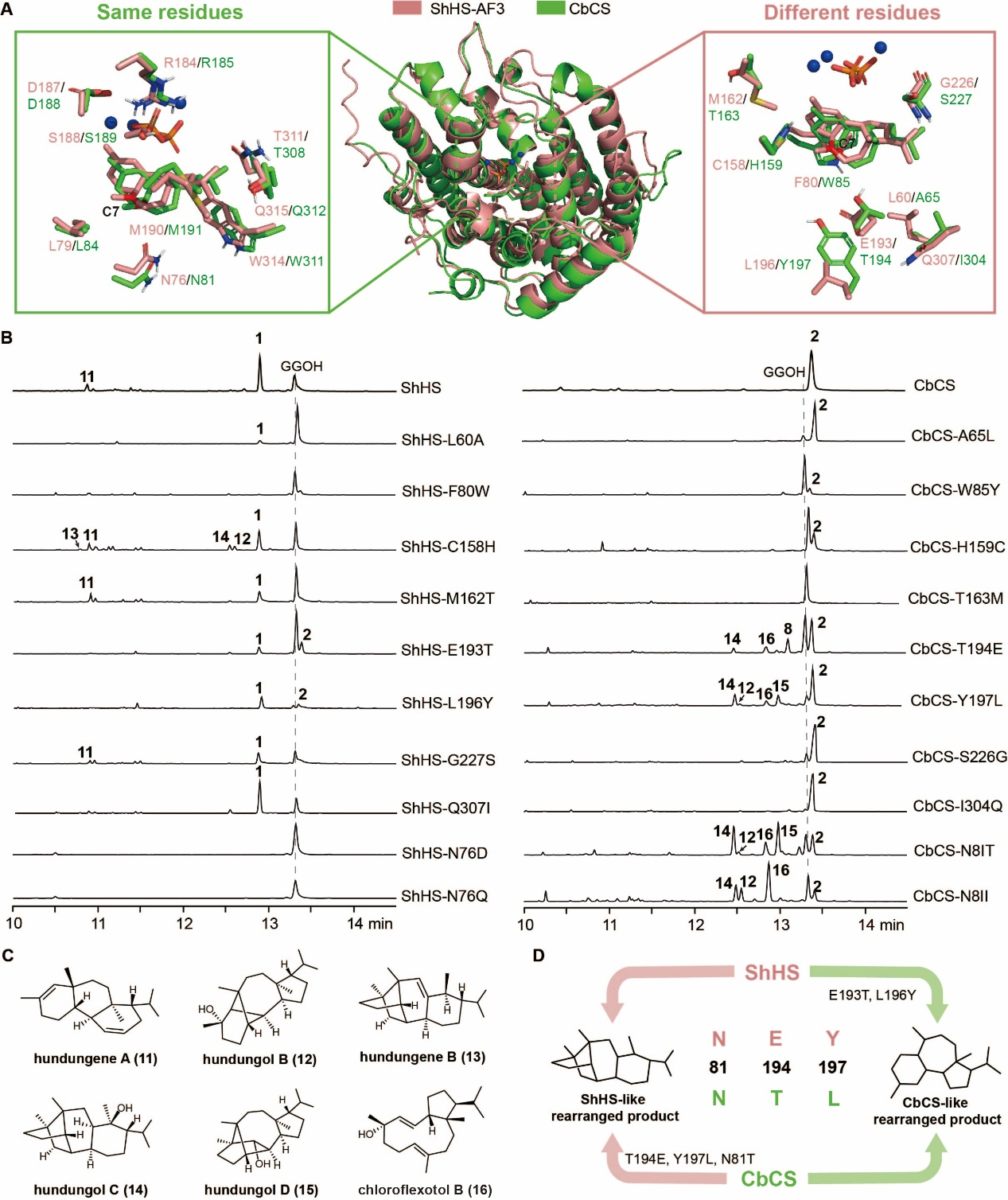 一个关键问题随之出现:是什么决定了CbCS和ShHS两个酶在分支点H之后的反应方向?为了回答这一问题,研究人员成功解析了CbCS的晶体结构,同时借助AlphaFold3完成了ShHS的结构预测,并将关键中间体H分别对接至两个酶的活性中心开展比对分析。结构分析结果显示,中间体H周围共有17个潜在参与催化的氨基酸残基,其中8个在两种酶之间存在差异。通过定点突变实验,研究人员成功实现了二者的功能互换:在ShHS中引入E193T和L196Y突变,可使其生成CbCS的主要产物;而在CbCS中引入相应的反向突变T194E和Y197L,则能产生ShHS的特征产物。此外,位于活性中心附近的关键位点N76/N81对反应路径同样具有重要调控作用。研究团队进一步利用这些突变体,分离鉴定出hundungol C、hundungol D、chloroflexotol B和hundungene C等多种新型二萜化合物,并通过同位素标记实验,验证了这些化合物具有共同的早期环化过程,以及后期的1,5-氢迁移机制。