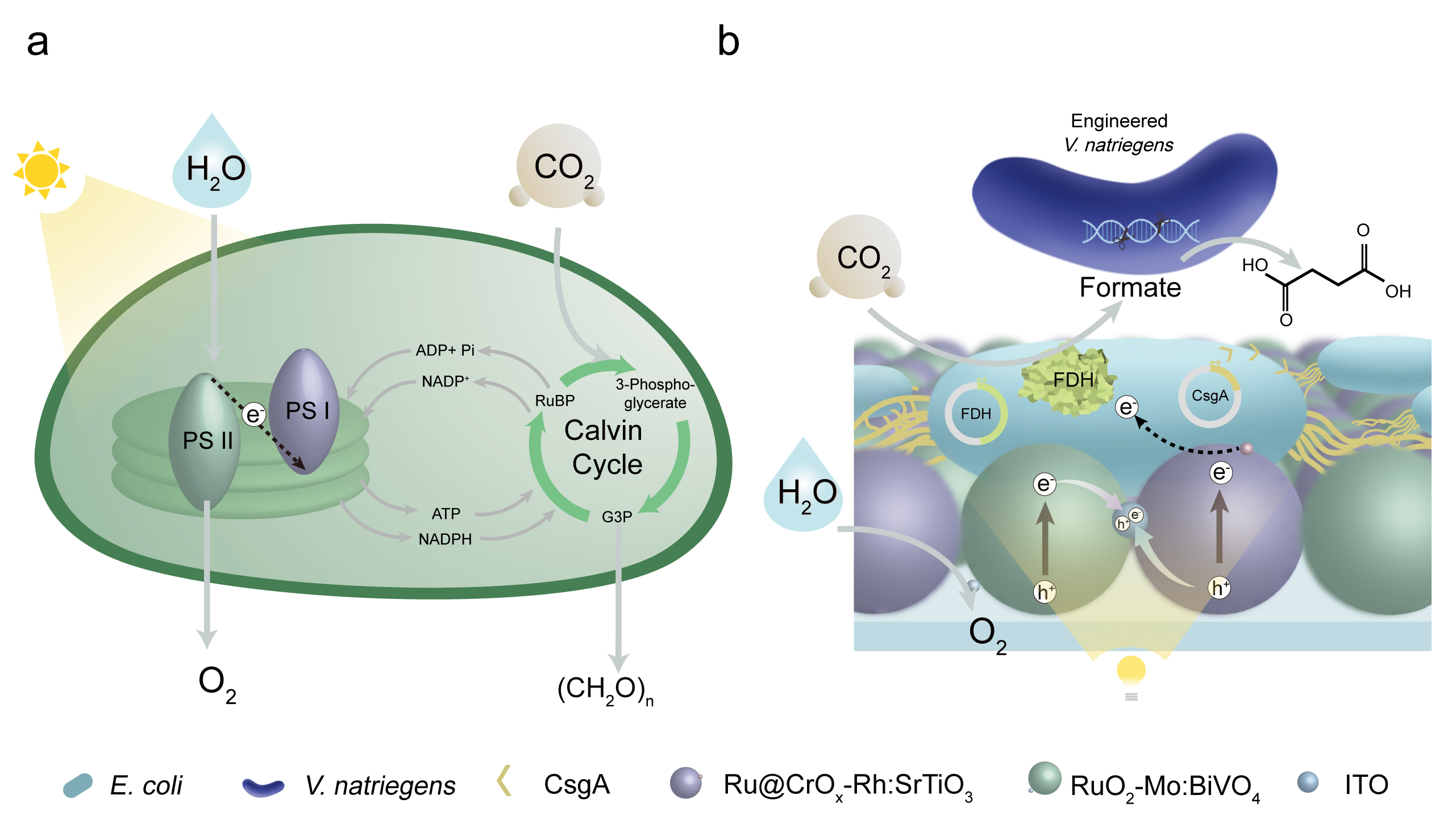 (a)天然光合作用;(b)人工生物复合体系